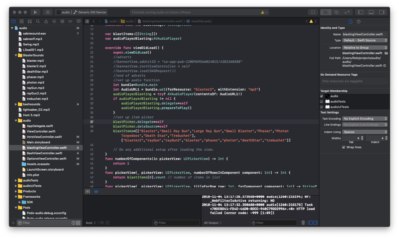 As you can see in the picture above XCODE lets you have a lot of different screens with ‘segues’ in between to travel amongst them (that’s the thin white arrows in the screenshot). Each one is a different screen for the user. In this way you can set up a whole set of different user experiences, each bringing something new to the app. Unfortunately I really only needed one screen, a lightsaber. However, in the interests of consumerism and ‘more is better’ I added a welcome screen with buttons.